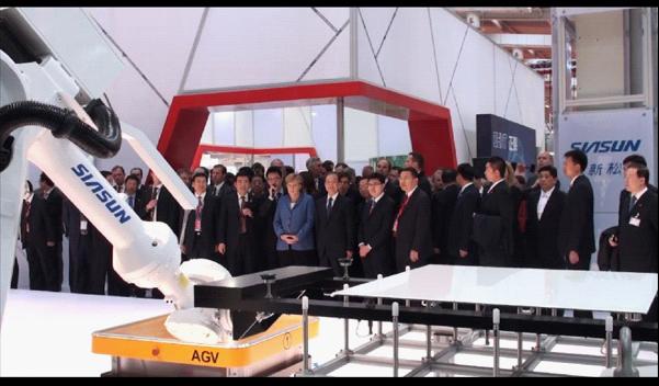 沈阳新松机器人股份有限公司作为中国机器人、自动化领域领军企业参加此次盛会。我公司受新松公司委托对此次参展以“绿色+智能”主题,设计并展出以新型自主工业机器人、洁净自动化装备和新能源换电站在内的国家“十二五”期间重点发展的战略新兴产业,同时以展板、宣传片形式展示新松在其他自动化成套装备领域取得的骄人成绩。展会期间中国总理温家宝、德国总理默克尔同时莅临新松公司展台,新松公司机器人事业部经理王金涛向总理介绍了新松公司产品,总理频频点头,对机器人的设计表示满意,勉励员工继续努力创新发展,为中国机器人产业发展做出更大贡献。(此段视频于央视13频道报道)作为新松机器人的设计单位,我们感到无比的骄傲,我们的工作得到了高度的认可。为未来的奋斗目标更加明确。更肯定了我们的奋斗脚步。