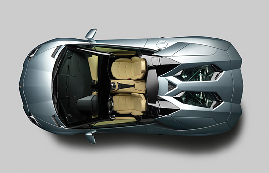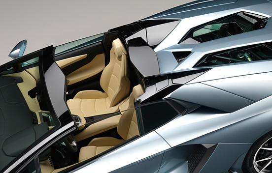 外观方面:此次亮相的Aventador LP 700-4 Roadster最大的特点就是其特殊的两片式碳纤维顶棚机构,其一反电动折叠的传统,必须以手动进行拆装,而拆下来之后的车顶则能够放置在车头的置物空间内,由于其采取了多种复合材料进行打造,使得这两片车顶仅仅拥有约5.9公斤的重量。而复合材料的采用在保证了轻量化之余,还拥有相当高的强度以保证整车的安全性。